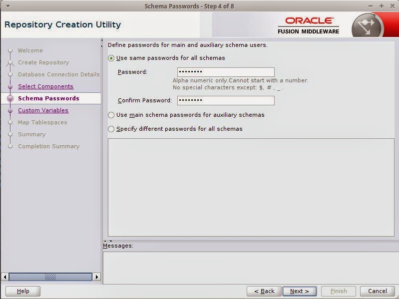 You need to provide the schema credentials, Best practice is to use different credentials and realtime environments Oracle DBA will assign this. It will create schema with same user credentials - here I prefer to use: welcome1
